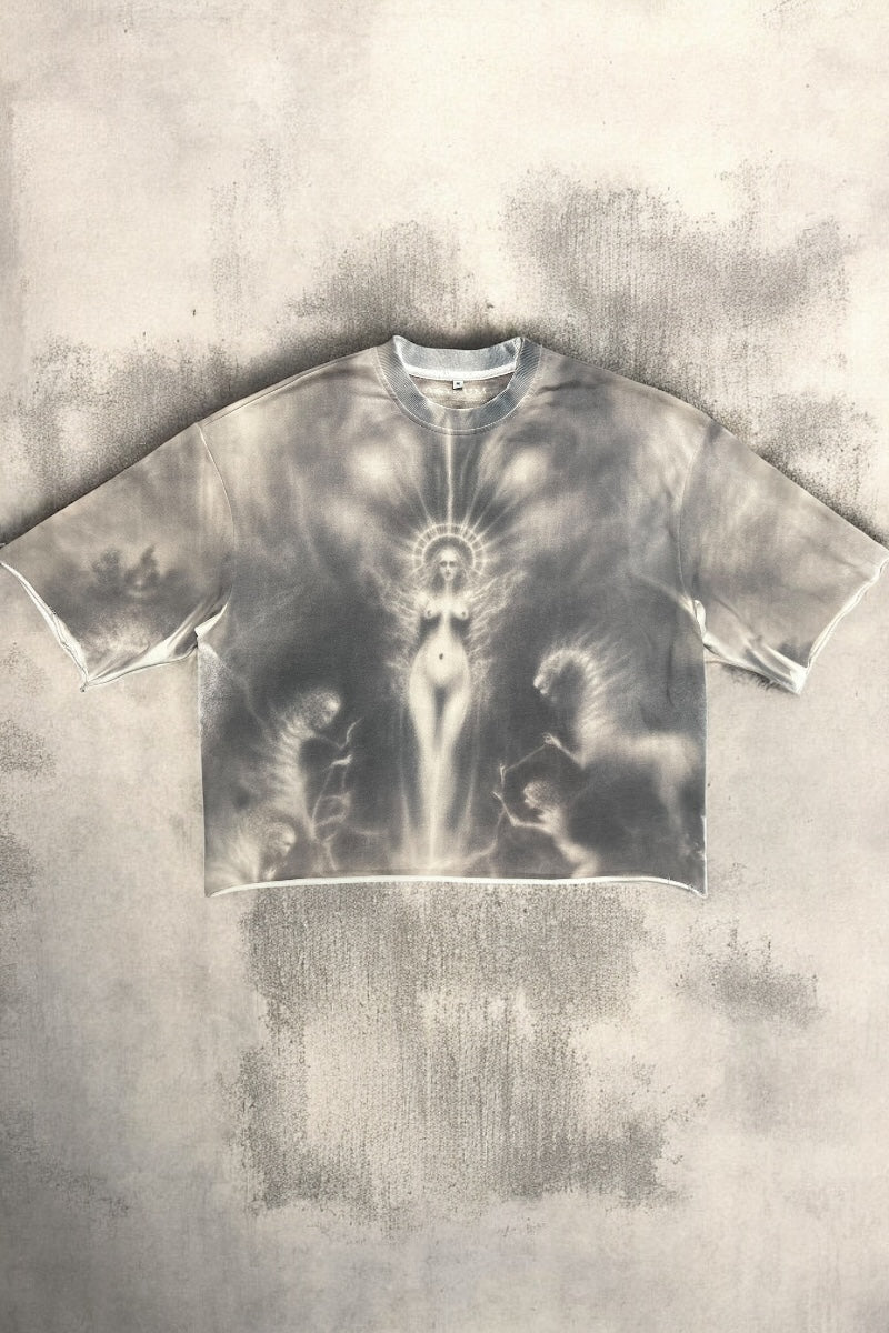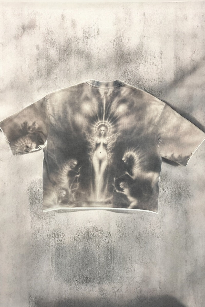 Introducing our cyanotype inspired T-shirt. Crafted from 87% cotton and 13% polyester, this t-shirt boasts a handmade cyanotype-inspired print (upgraded to last through sun and washing machine), finished with raw hem and sleeve ends for a natural, unrefined edge.